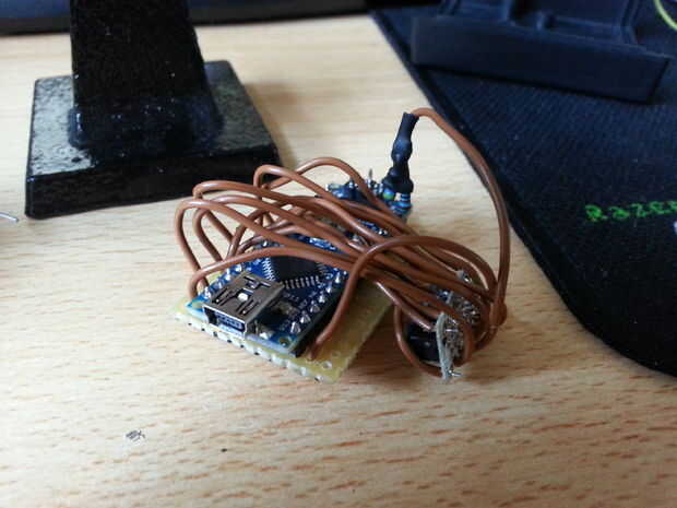 Soldado un Arduino Nano a una junta y en ese tablero de soldaduras de los cables