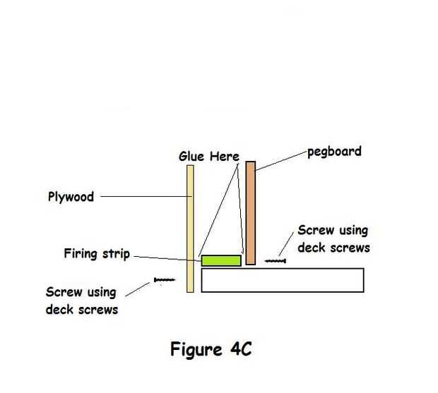 Agregue el pegamento a los lados superiores de todas las tiras leña Inserte la pegboard y atornillar las tiras leña utilizando los tornillos de la cubierta. Cuando se seca el pegamento la pegboard actuará como una cinta aumentando la fuerza del marco. Nuevo corte de la madera contrachapada de 1/4 de pulgada y en dos 48 pulgadas por 48 pulgadas cuadrados. Coloque cada hoja de madera contrachapada en el frente del marco. Para detalles véase la figura 4.