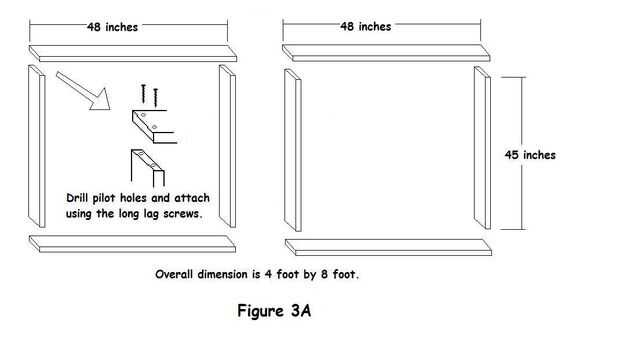 Sobre una superficie plana hacer dos marcos de 4 x 4 pie colocando las placas de 45 pulgadas a dos de la 2x6s de cuarenta y ocho pulgadas como se muestra en la Figura 3A. Taladre un orificio guía y conectar las tablas de 2 x 6 usando los tornillos largos de retraso.