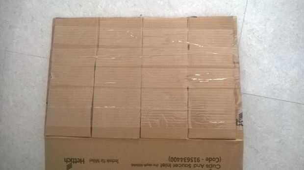 3. Ahora doblar la caja y pegar 4 trozos de las aletas en un lado de la parte trasera de la caja con cinta adhesiva (esto es para crear una base pesada para que la caja permanece vertical cuando se coloca sobre una superficie plana)