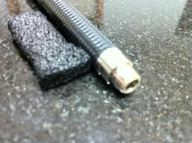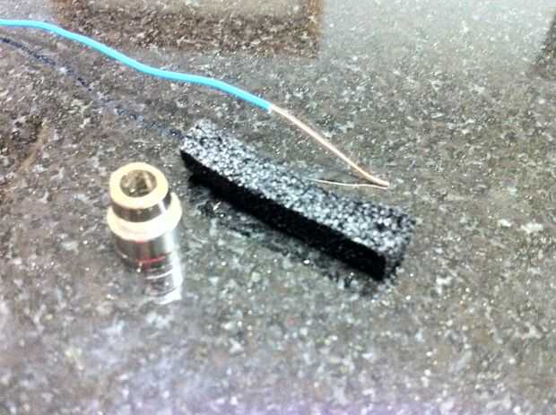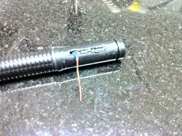 Tornillo de la punta hacia atrás con el cable que viene del orificio que se hizo en el cuerpo. Utilice el soldador para derretir una arboleda en la zona de tapa una parte rayada del cable en.