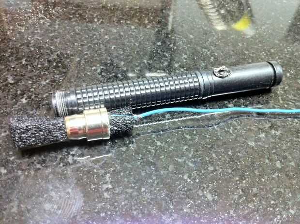 Utilice un soldador para hacer un orificio en la zona donde la tapa se fija al cuerpo. El alambre se pesca a través del orificio. Uso del soldador hacer algo de una rampa que es más fácil conseguir el cable para salir del agujero en el cuerpo.