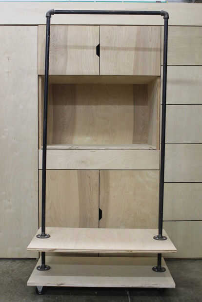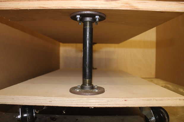 Ahora el carro armario rodante. Primero, corte dos 15 "x 30" pedazos de madera contrachapada. En segundo lugar, atornille los tubos como aparecen en las fotos, salvo licencia sólo pone una pestaña en cada uno de los tubos de corta por ahora. Coloque los tubos cortos con la brida de centrado en la longitud corta de la tabla y deje un espacio de 1/2" entre el extremo de la brida y el extremo de la tabla. Perfore cuatro agujeros a través de la Junta Directiva donde están los agujeros de la brida. Tome el 1-1/4" tornillos y tuercas y asegure la brida de la Junta. Repita el proceso de alineación y perforación para el estante superior y coloque los tornillos por los agujeros que están pegando a la parte inferior. Ahora Atornille la brida en la parte superior de cada uno de los tubos cortos, alinearlas con los tornillos que sobresalen de la parte inferior de la plataforma y asegurar las piezas junto con las nueces. Por último, voltear el carro a su lado y coloque las ruedas para que las dos ruedas giratorias están en el mismo extremo y dos fijados en el mismo extremo.