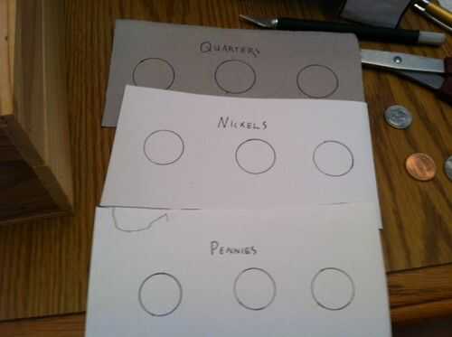 se trata de un compaginador de la moneda de la Junta de tarjeta que hice. comienzo con una caja de tejido corte abierto insertar cartón tres clasificadores cerca de la caja y ordenar sus monedas. para los insertos de hacer la primera apenas más grand