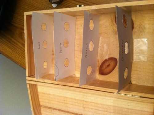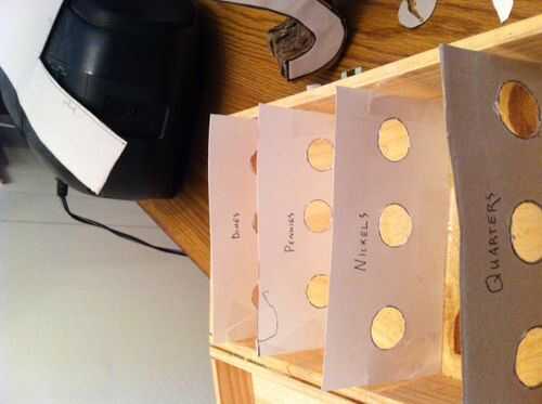 Ahora lo que necesita hacer es alinear los divisores en su caja en orden. Primero se establezca en la ranura trimestre luego cinta adhesiva en. A continuación va níquel entonces penny entonces dime. Recuerda que van en orden de tamaño más grande al más pequeño no por el valor del dinero. Trate de les espacio tan uniformemente como sea posible.