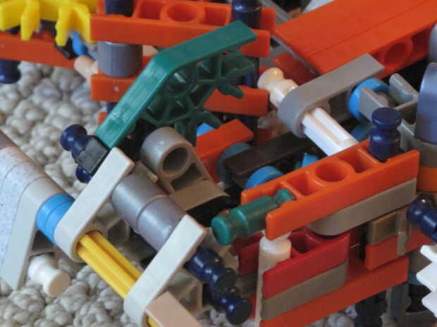 PIC. 18 - primer plano mostrando la posición de la varilla del blanco. La punta cerca de la bisagra negra debe estar en el conector rojo. Además, la barra blanca si tiene un ajuste ceñido, así que incline el conector gris oscuro (cerca del conector verde) hacia el conector gris claro en la parte posterior.