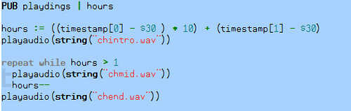 ¿Por qué marca de tiempo [3] == $30 en vez de marca de tiempo [3] == 0? Porque el objeto reloj de tiempo real devuelve la versión ASCII de cada numeral. Cuando timestamp [3] es igual a $30, es el carácter ASCII '0'. Cuando se pasa una hora, nos activan reproducción llamando al método playdings.