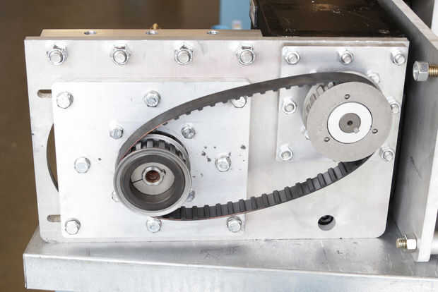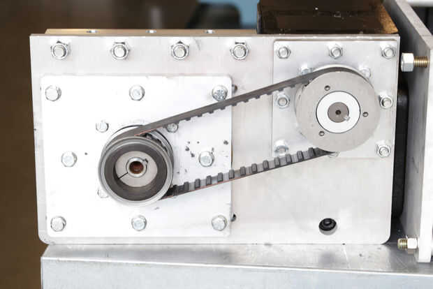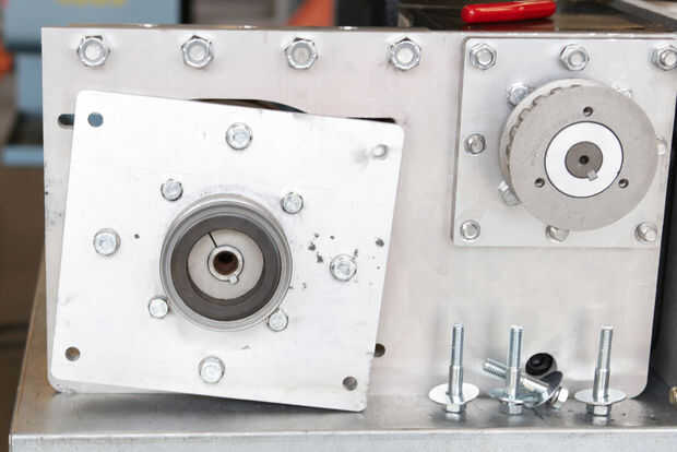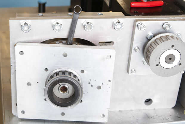 Deslice la placa de la caja de engranajes hasta que la polea se hace autodidacta.