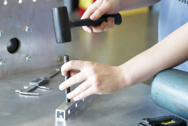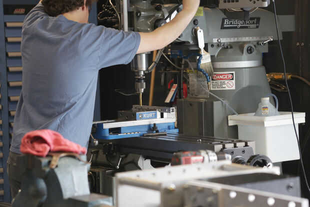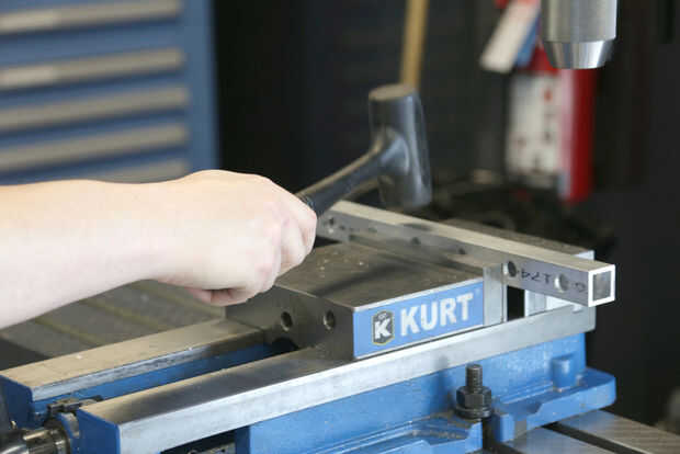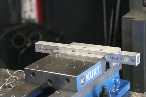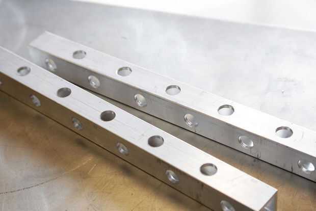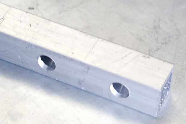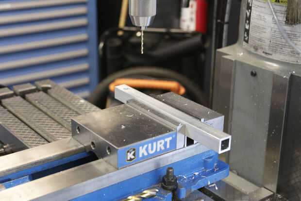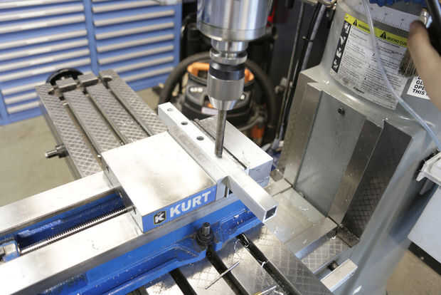 A partir de una pulgada de cualquier borde de una del pie largo 1" cuadrado stock, perfore un orificio de 1/2" en el centro cada dos pulgadas.