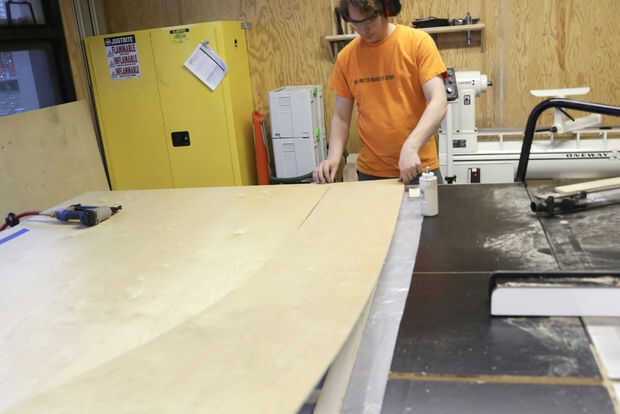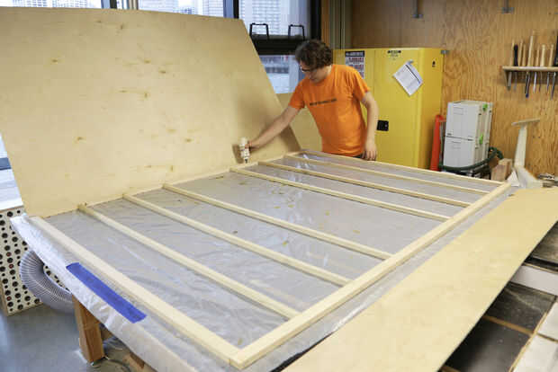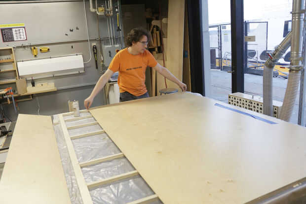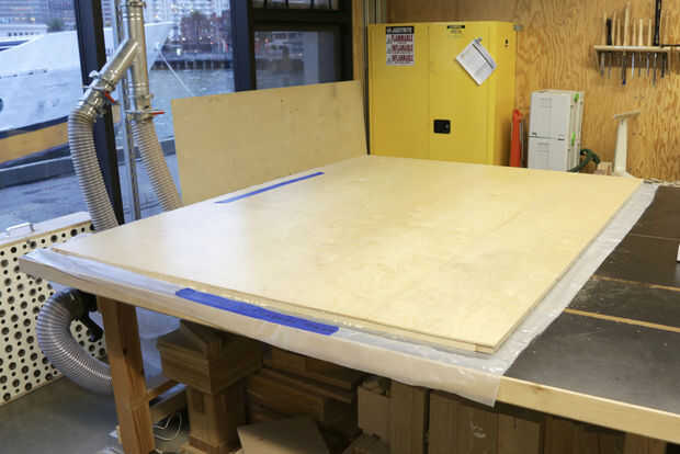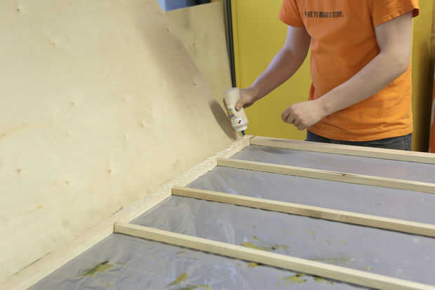 Una vez seco el marco interno, puse a paneles de madera contrachapada de 1/4" sobre la parte superior del marco. Puesto que suele ser madera seccional estándar sólo 4' de ancho y al parecer han parado 5' amplia gran tamaño 1/4" madera contrachapada de la fabricación, tuve que usar dos hojas - una hoja de 12" x 80" y una hoja de 48" x 80".