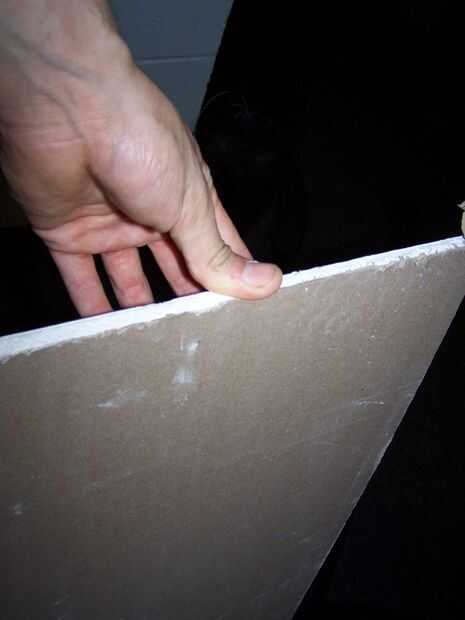 Gire el panel de yeso en su parte posterior (lado con respaldo de papel) y la pared basada en sus medidas. He puesto una regla en la superficie de la pared con el fin de cortar una línea recta. Tome una regla y pasar a través de las líneas esbozadas un par de veces hasta que no corte a través. No preocupación de no corte completamente a través. Cuidadosamente levante el yeso y la curva que la pieza en la línea de corte, el yeso se rompe. Ahora, puede tomar su borde recto y corte el respaldo de cartón. Este material obtiene sucio, usar una máscara y cubrir el piso o alquilar una aspiradora industrial.