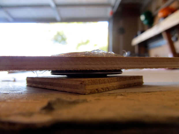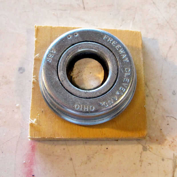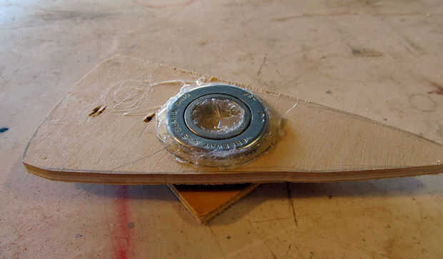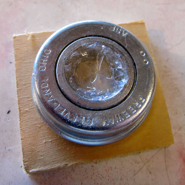Coloque el cojinete alrededor de la espiga y centro lo mejor pueda. Luego llene el área entre la pared del cojinete y espiga con pegamento caliente y deje que se enfríe y seque completamente. Luego coloque la pieza superior sobre el cojinete y pegamento caliente en el lugar. Utilice tanto como quieras. Usé una buena cantidad para asegurarse de que todo era sólido y no va a venir aparte.