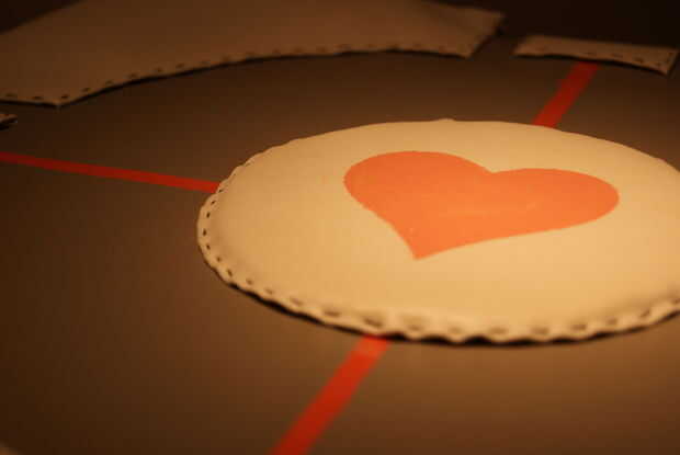 Para pintar los corazones en los círculos, tomar la plantilla con el corazón de la corte y poner sobre los 5 círculos de piel, manchas color rosa cuidadosamente con un cepillo grueso.