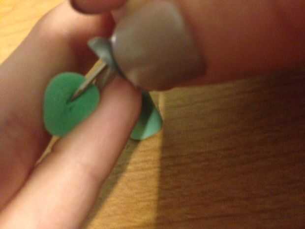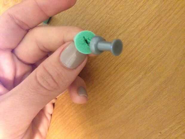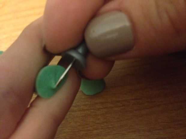 Usando el objeto puntiagudo agudo, comienzan a recoger un agujero en la parte inferior (lado plano) de su enchufe oreja recién cortada. La tachuela comenzará a rasgar un agujero en el tapón. Trate de sacar tanta espuma del agujero como sea posible. ¡ Buen trabajo!