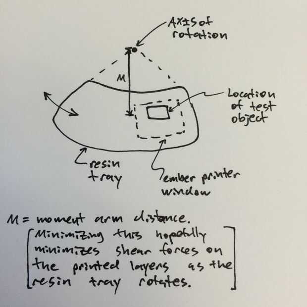 Además de estos ajustes, el más pequeño objeto de ensayo se colocó lo más cerca del eje central de ember como sea posible, para reducir el brazo de momento, y la velocidad relativa entre la superficie de la impresión y la ventana que gira para separar una capa de curado de la ventana (ver imagen dibujada de la mano)