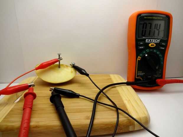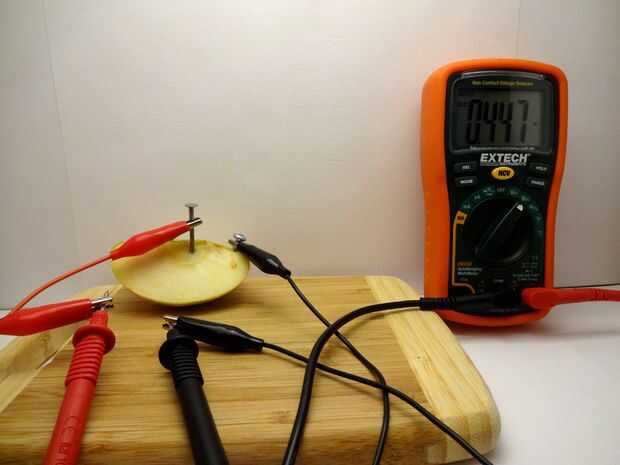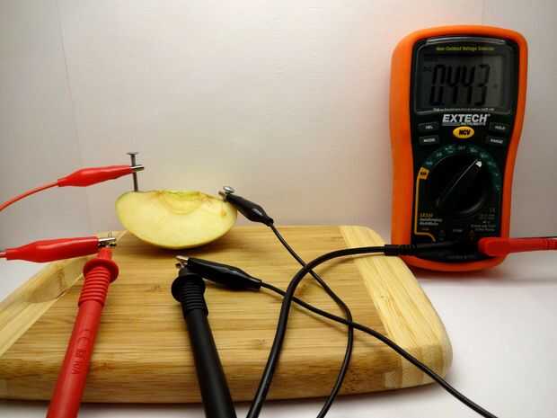 Ahora, podríamos conseguir un montón de manzanas más y hacer más pilas así, pero resulta que la tensión y corriente de una célula es dependiente sólo de la química de ese celular y no el tamaño. Por esta razón pilas AAA, AA y D pueden todos tienen el voltaje, pero diferencian extensamente en las actuales capacidades de entrega y toda la vida.