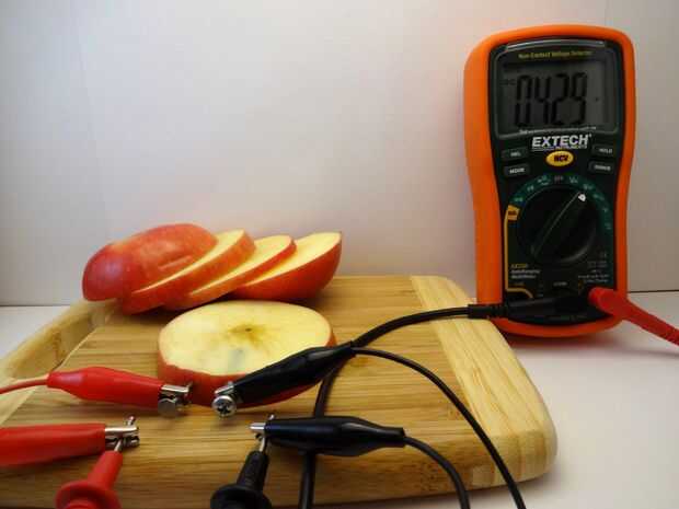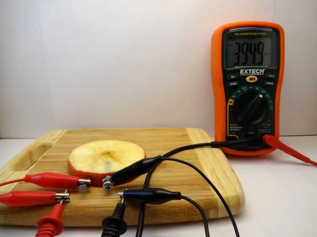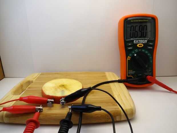 Como nota lateral, tuve que dejarlo para un poco de tiempo tomar una llamada. Cuando regresé, tanto el voltaje y la corriente de la batería habían disminuido, como una batería real sería durante toda su vida. En este caso, podría haber varios mecanismos para esto - se podría secar la manzana, los electrodos podrían ser desarrollar una capa de óxido, incluso deslizarse o hacer contacto pobre con la manzana.