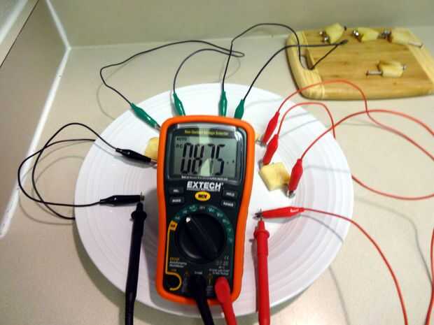 Podemos incrementar nuestra tensión limitada por poner varias de estas células en serie. Esto significa conectar el positivo de una célula a la negativa de la siguiente y así sucesivamente, añadiendo tensión sucesivas. Así, poniendo 4 células en serie debe dar unos 4 * 0.43 V = voltios de 1,72