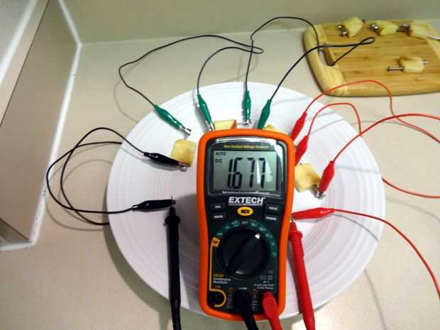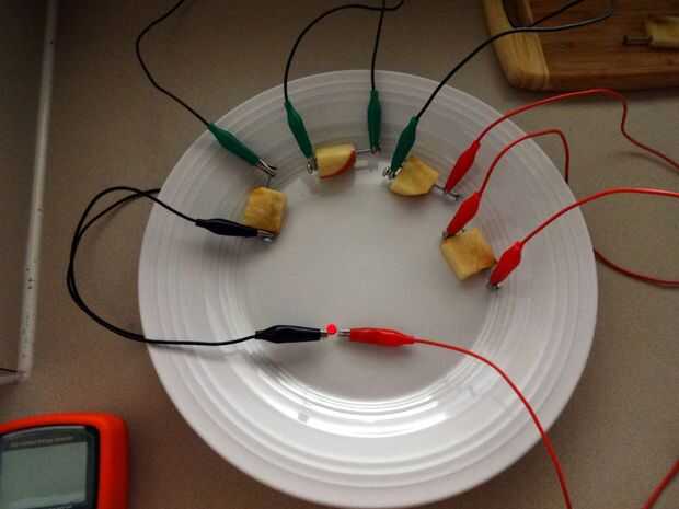 Muy bien, así que podemos hacer aún mejor. Realmente basta con trocitos de manzana para proporcionar un área seccional transversal decente mientras espaciado hacia fuera electrodos estrechamente. (Tenga cuidado de no corta accidentalmente los electrodos, o usted no conseguirá ninguna corriente o voltaje)