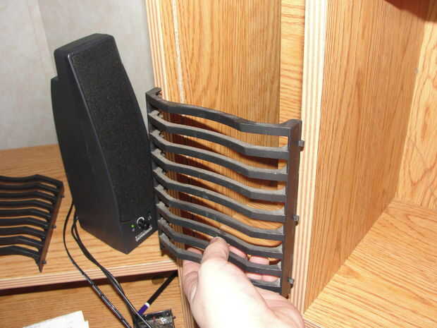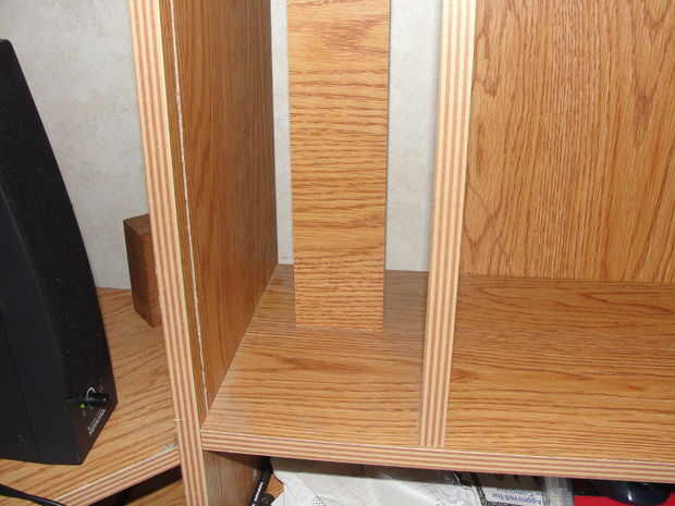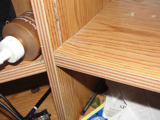 Por desgracia, hay una tira de madera en medio de mi estante nuevo. Utilizando el mismo método que la puerta para debilitar a las clavijas de madera en la parte superior habría sido mejor que lo que hice, que se iba a romper por la mitad por golpeando. La parte inferior de la plataforma separada del resto, un poco dañado ahora. Cortando un trozo de la barrera quitada, yo puedo simplemente apuntalar la esquina dañada, ningún daño real.