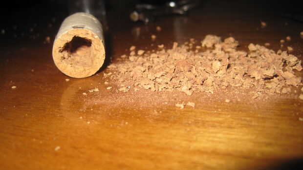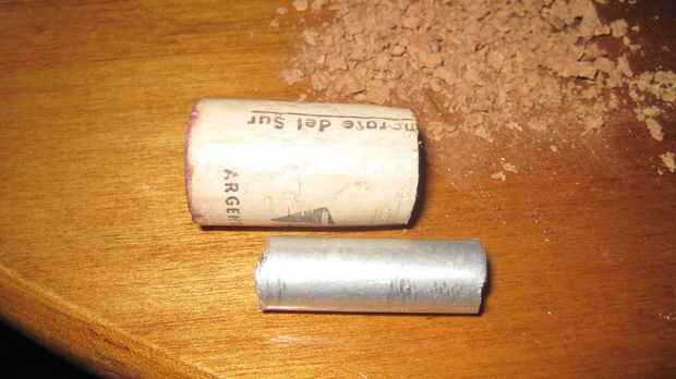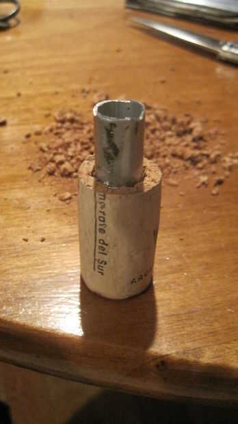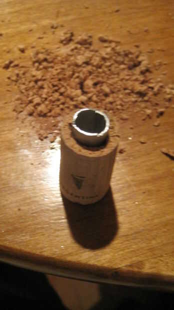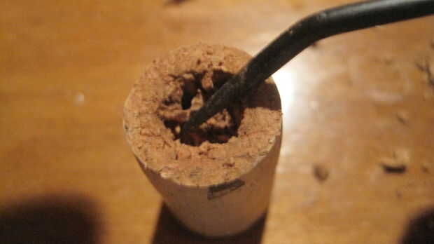 Una vez finalizado esto, corte el tubo para que quepa en el interior del corcho. Inserte el tubo en el interior del corcho. Asegúrese de que golpea la parte inferior dejando todavía un 1/8" de la tubería que sobresale de la parte superior. Esto actuará como el labio de la tapa.