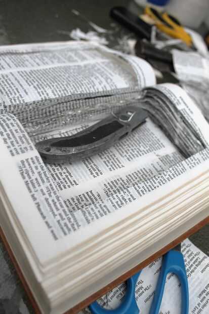 Poner todas tus cosas locas en el agujero de la Biblia. Compruebe corte lo suficientemente profundo cerrando el libro, y comprobándolo cierra correctamente!