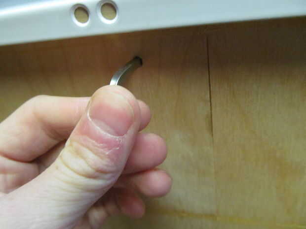 -Uso el extremo doblado del gancho para extraer el borde levantado otras hasta que se puede agarrar el fondo falso y extráigalo.