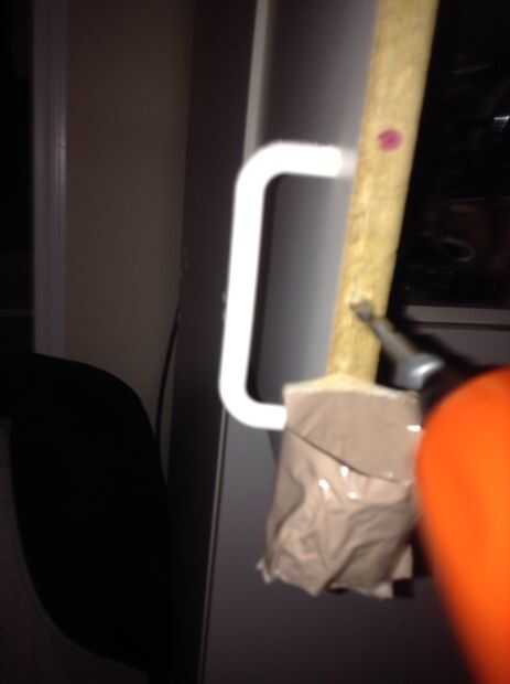 La taza de cinta del conducto en el lado de la puerta justo debajo de donde desea que el agujero y empezar a taladrar su agujero del palillo