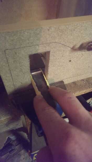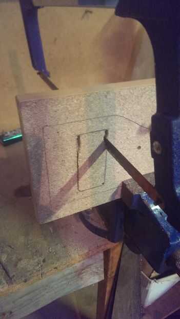 Una vez rastreada la ranura, 3 o más agujeros al lado de la esquina y conectarlos arrastrando el taladro para los otros agujeros. Esto debe ajustar la hoja de una sierra para metales, quítate la hoja y vuelva a conectar a través del orificio. Ahora puede cortar la madera y repita para los otros lados. Esto sería mucho más fácil si tuvieras acsess a una sierra de calar. Si los bordes son aún ásperos puede envolver en papel de lija alrededor de un cincel u otro objeto similar y lije los bordes planos.