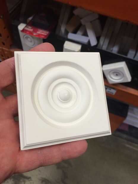 La roseta es una pieza cuadrada decorativa que se utiliza a menudo para las esquinas superiores de puertas y ventanas. El 3 1/2" cuadrado que encontré empareja el tamaño de la clave de Tot Lok y serán perforados hacia fuera a ser el escondite para la clave. Recogí estas en casa depósito, uno para cada esquina superior de la puerta.