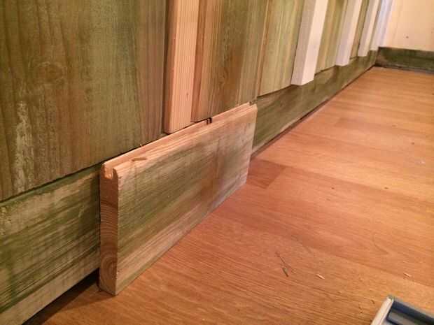 Pongo en un zócalo simple "marcador" que se tratarán más adelante. Esto me permitió establecer las tablas de ranura y lengüeta en una altura constante sobre el piso. Asegúrese de "dry-fit" cada junta para asegurar que se ajusta antes de usar el adhesivo. Si todo está bien, aplique el adhesivo de construcción en la parte posterior del cheque 1 x 8, que es plomo y clávelo en su lugar. Hacer lo mismo con el siguiente 1 x 8. Entre cada dos 1 x 8 Coloque un 1 x 2. Aplicar el adhesivo, compruebe plomo, uñas. Repetir.