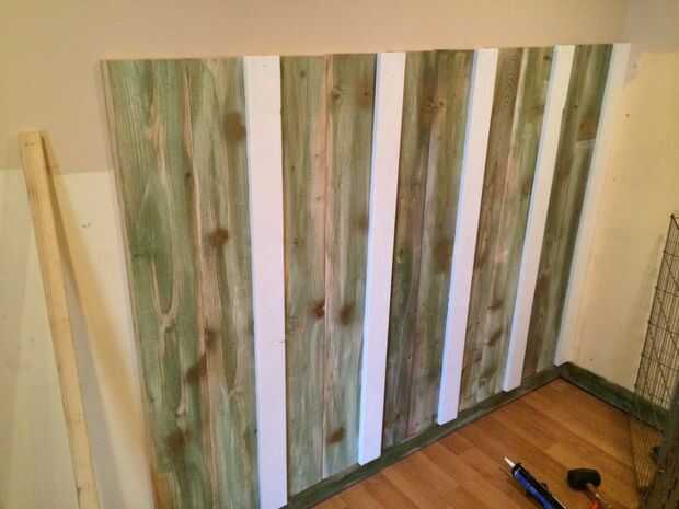 Para hacer una puerta que se funde con el entorno, tamaño de las cosas es crucial. Pongo en 1 x 8 juntas de ranura y lengüeta en pares, seguidos de un plano 1 x 2. Esta combinación hace un patrón de 16" paneles de ancho debido a las verdaderas dimensiones de la madera de construcción nominal. Pensé que este patrón de 16" sería importante, para que coincida con el espacio habitual de los postes, pero ya que estaba pegando las tablas arriba, era inmaterial. En las fotos, son de color verde de 1 x 8. 1 x 2 están ocultos, cubierto por pintado blanco 1 x 4.