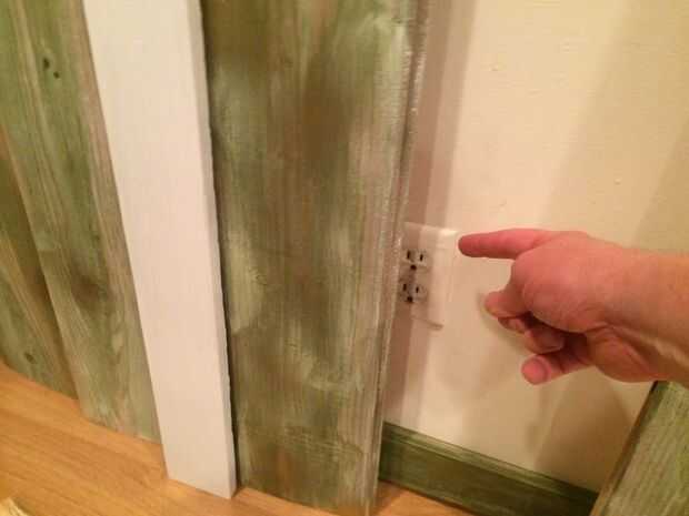 En primer lugar, me di cuenta de la separación de las juntas para que los interruptores y enchufes eléctricos sería en los espacios con las placas verdes. Tuve suerte en que la forma de la habitación fue presentada con una chimenea, que el revestimiento natural fue roto en 4 secciones, puertas y muebles. De esta manera era más fácil modificar la colocación del patrón para los enchufes. Cada enchufe o interruptor es necesario tener una caja de extensión puesta en él para llevar a cabo de la nueva pared.