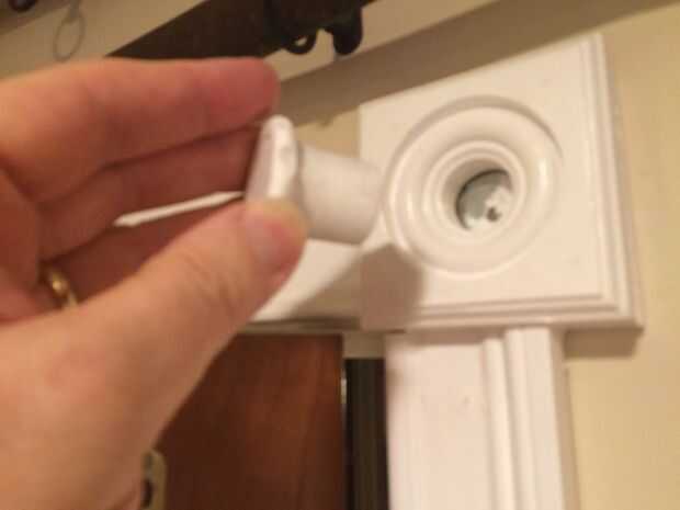 Justo al lado del gabinete oculto es la puerta de entrada a la sala. Poner guarnición nueva alrededor de la puerta y en las esquinas superiores utiliza dos rosetas que había taladrado con una broca Forstner 1". Verifique que el orificio que sea lo suficientemente grande como para adaptarse a la llave magnética en, pero no tan grande que cualquier diferencia es notable. Quiere pintar la roseta y la clave del partido, y que añadirá un poco a las dimensiones. En la pared detrás de la roseta até una arandela grande "fender" para dar el imán algo para tomar.
