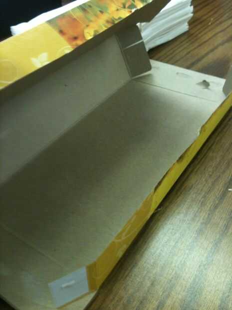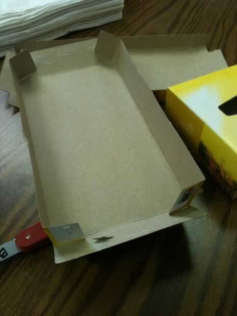 abra un solo lado de la caja y quitar los tejidos. (Necesitará en un paso posterior)Paso 1: El interior Cortan la parte inferior de una caja de tejido diferentes.Paso 2: "las aletas" Abra un lado de la caja arrancó la parte inferior y rasgar las