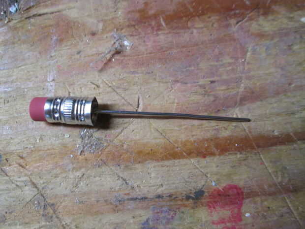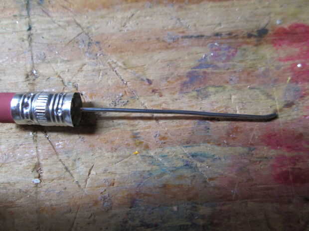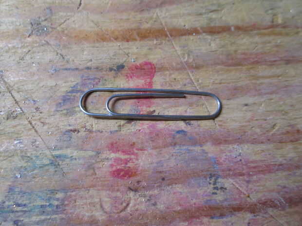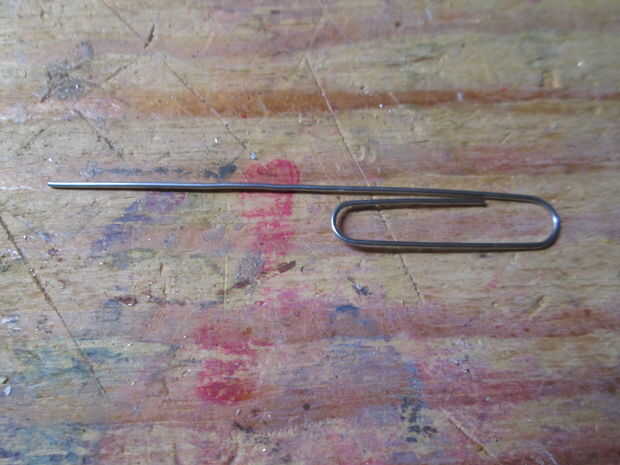 Para usar el clip como un gancho, yo simplemente enderezar una pieza de un clip y corte el resto que no necesitaba. En comparación con la longitud de mi hilo a la profundidad del agujero era y era demasiado largo. Para solucionarlo, recortan el exceso, también. Cuando tuve una longitud satisfactoria, empujó en el borrador que hemos quitados antes. Entonces tomé dos alicates para añadir una pequeña curva en el extremo del alambre.