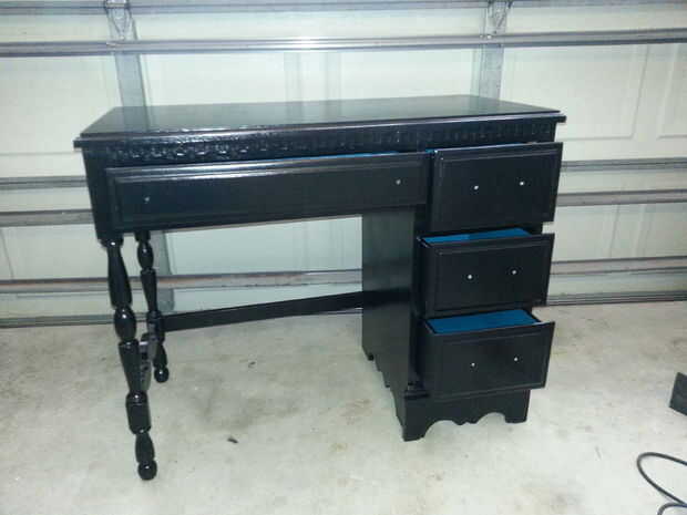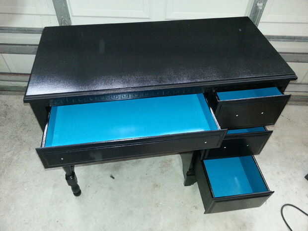 En primer lugar, mi esposa compró esta tabla de cuatro cajones (1 cajón estrecho, 3 cajones más profundos) en blanco que nos golpearon bastante. usa removedor de pintura para quitar la pintura vieja y me lija suave. entonces noté una gran diferencia entre el último cajón y la parte inferior del escritorio. La parte inferior de cada cajón tenía una partícula / parte inferior del tablero tarjeta gruesa debajo de la guía de cajón que fue cortada para caber en muescas en la parte delantera y posterior del cajón debajo de la guía. era capaz de curva que el cajón más bajo lo suficiente no para romperlo pero aún ser capaz de quitarla si puse el escritorio en el piso. con ese pedazo hacia fuera luego retira a la guía en el cajón más bajo. fue grapado en la parte delantera y la espalda, que me recuerda que también quité la parte trasera detrás de 3 cajones. también se hizo de la misma Junta de tarjeta como material. antes de que quiten la pieza inferior del cajón debajo de la guía (no sé qué su llamado, lo siento) dibujé una línea donde se deslizó en las muescas y cortar las piezas de (aproximadamente 1/4" en la parte delantera y trasera)