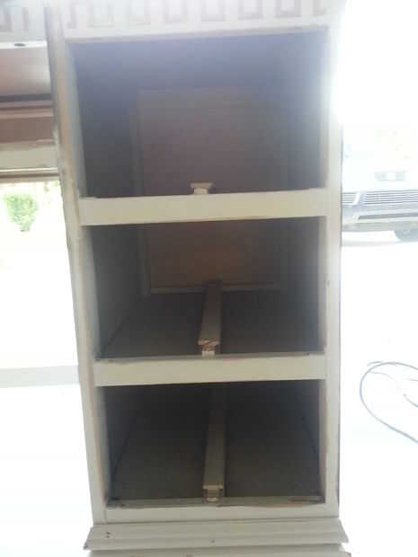 Después de retirar la guía y el panel posterior pude medir la longitud y el ancho que necesitaba. Corté un pedazo de madera contrachapada de 1/4 del tamaño necesario y la clavó con una pistola de clavos justo por encima del arco decorativo en la parte inferior del lado de la mesa. Esto me dio una zona profunda de 6"- 7" por debajo de la gaveta inferior que no podía ser vista. incluso establecen se parece a la parte inferior de la zona de cajón. Entonces pegué y clavó a la guía del cajón al tablero de partícula/tarjeta que corté para que no se deslizó en las ranuras, ahora era todo una sola pieza (que era exactamente como se veia antes me di cuenta de que no se adjunta). Encontré dos pequeñas bisagras en mi montón de chatarra y con grapas de un lado a la debajo de la parte posterior de la partícula / tablero de tarjeta que tenía la guía que se le atribuye, también apliqué algunos pegamento para madera para reforzar el área que fue sujetado con grapa. Entonces encontré a algunos pequeños 1/4" tornillos que utilizaba para sujetar la parte inferior del cajón con la guía de la zona que originalmente fue utilizada como una muesca antes de recortar la partícula / tablero de tarjeta. Esto permitió que los guía a ser levantado sin que estable que el cajón de abajo a no ser bien apoyado. Reemplacé la parte de atrás con planchas de madera fina que tenía puesta alrededor para cubrir el compartimento de nueva construcción y había pintado de cada cosa un negro plano y aplica 2 capas de poly semigloss.