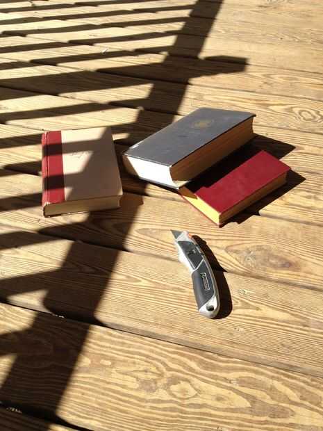 Necesita un par de libros para copias de seguridad en caso desastre para arriba en la primera y una navaja para cortar las páginas (he probado a usar otras herramientas, pero los trabajos de hoja de afeitar lo mejor).