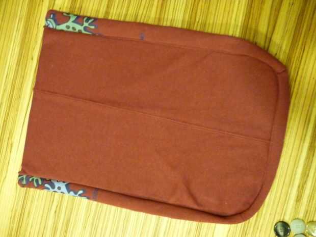 Antes de coser la parte posterior del compartimiento a los lados, hacer cuatro ojales en las esquinas (para atar el compartimiento en la parte posterior de la mochila más adelante). Tener en cuenta la ubicación de los tornillos de la parte trasera de la mochila (que no lo hacía, así que tuve que dejar de lado un tornillo). Entonces pin y coser la parte posterior del compartimiento.