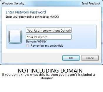 Usted necesita para asegurarse de que el nombre de usuario que ingresa para iniciar sesión en el equipo tiene una contraseña, luego entrar esa misma contraseña en el cuadro de inicio de sesión. Uso la cuenta de administrador porque está oculta. Este es el tipo de mala práctica, pero funciona para mostrar el principio