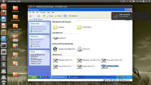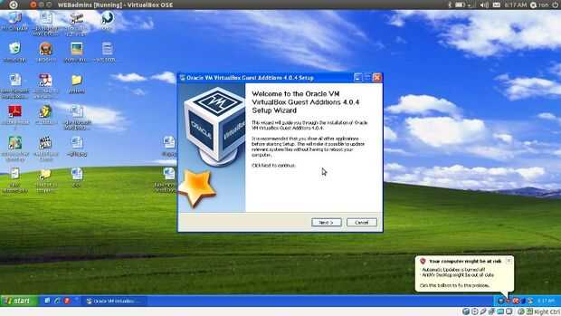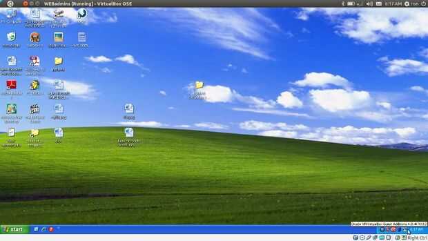 Primero instalar VM virtual box guest complemento antes de continuar. Para ello primer arranque la máquina virtual de windows que está dentro de la máquina HOST Ubuntu, luego haga clic en dispositivos en la esquina superior izquierda y luego haga clic en instalar Guest additions (cltl + D), esto será descargar e instalar además en la máquina virtual de windows xp. Reinicie su máquina virtual después de instalación además de invitado.