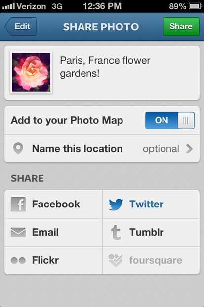 Al presionar el botón verde en la parte superior derecha, Instagram también compartir la foto a los destinos que usted puso de relieve.