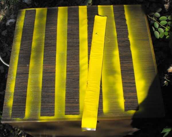 hice las rayas de la carretera por la que se pega la cinta a una superficie relativamente limpia y rociar hasta que vi todo amarillo y no gris. El plástico por el camino entonces consiguió pulverizar negro sólido. Bastante sencillo!