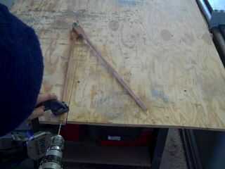 He perforado un orificio piloto de 1/8" en uno de los extremos y luego condujo un tornillo medio yeso en la pierna. Tomé para amoladora de banco y había alisado en una punta afilada de acero.