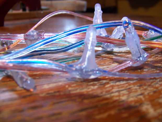 Finalmente, cuando ya tienes todos los LED pegado en su lugar y probado para asegurarse de que tienes las conexiones, sacar la vieja pistola de pegamento caliente e ir a la ciudad. Como se puede ver en mis horribles fotos borrosas, he gobbed hasta la cola todo los cables de los LEDs y a lo largo del cable para asegurarse de que todo es robusto.