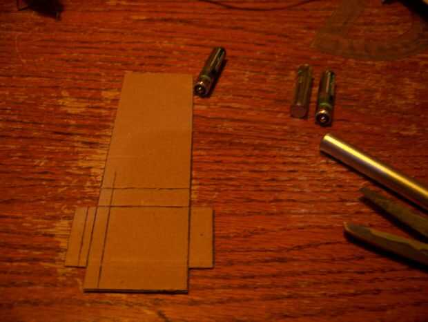 Para construir el soporte de la batería, usted necesitará medir 3 baterías AAA y construir una caja alrededor de ellos. Puedes ver en la imagen cómo construir un corte que simplemente pliegues hasta hacer un cuadro. Envuelto en cinta aislante para mantener seguro y utiliza los imanes de disco para mantener la tapa cerrada. Utiliza una combinación de imanes y papel de aluminio en el interior para conectar las baterías en serie y corrió un cable desde cada extremo a la parte posterior, donde tuve mi polar imanes alineados.