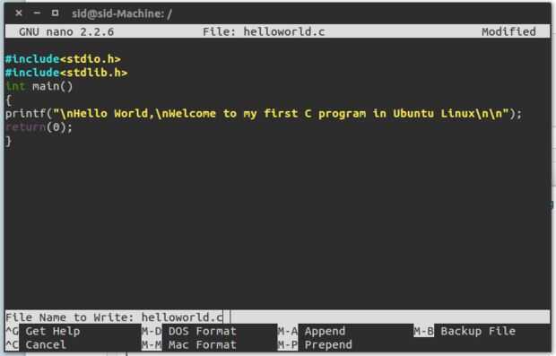 Escriba el código del programa en el editor nano. Por este tutorial estará haciendo un programa de simple helloworld.