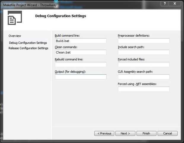 Escriba Build.bat en el cuadro de construcción de línea de comandos. Introduzca Clean.bat en el cuadro de comandos limpio. Borrar el contenido de la caja de salida. SKIP para liberar la configuración dejando la misma como marcada casilla de depuración. Haga clic en finalizar.
