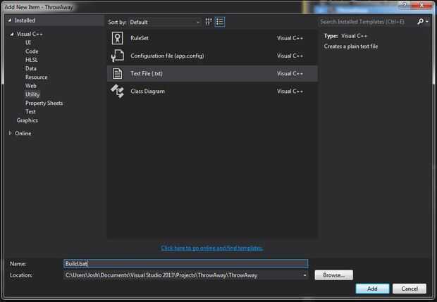 Agregar un archivo por lotes para construir usando texto de utilidad archivo llamado build.bat. Asegúrese de que se encuentra en el nivel de proyecto. Agregar un archivo por lotes para construir usando texto de utilidad archivo llamado clean.bat. Asegúrese de que se encuentra en el nivel de proyecto. Este archivo no se utilizará en esta versión de este instructable pero finalmente se debe crear una función limpia. Reconstrucción también es buena pero en un pequeño programa que podemos hacer sin él.